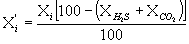 где Х'i - объемная доля компонента i, рассчитанная по хроматограмме, полученной на колонке с цеолитом, %; Х"i - объемная доля метана и неуглеводородных компонентов, рассчитанная по хроматограмме, полученной на колонке с эфиром ТЭГМ, %. Примечание. Если в газе присутствует сероводород, и вводимую на анализ пробу газа предварительно очищали от сероводорода и диоксида углерода, концентрации которых измеряли другими способами (п. 1.1.3), то вычисленные по пп. 1.5.1 и 1.5.2 результаты хроматографического анализа должны быть скорректированы на объемные доли сероводорода и диоксида углерода по формуле