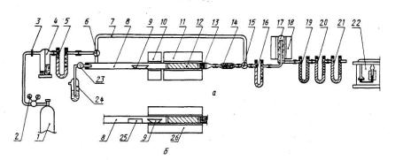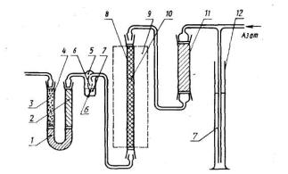где m4 - масса навески бензойной кислоты, г; V - объем раствора метоксида натрия, израсходованный на титрование, см3. 6.2. АппаратураПринципиальная схема установки для определения кислорода полумикрометодом приведена на рисунке 5. Вся аппаратура в установке должна соединяться с помощью шлифов кроме приборов для поглощения диоксида углерода. 6.2.1. Устройство для очистки азота. Типичное устройство для очистки азота (рисунок 6) состоит из следующих частей. 6.2.1.1. Регулятор давления, содержащий вазелиновое масло медицинской чистоты. Пригоден цилиндр высотой 300 мм и диаметром 50 мм. 6.2.1.2. Вертикальная трубка высотой 120 мм и внутренним диаметром 30 мм, наполненная перхлоратом магния (6.1.5.). 6.2.1.3. Вертикальная кварцевая трубка длиной 300 мм и внутренним диаметром 15 мм, наполнена пористой медью, нагреваемой до 500°С. Пористую медь получают при восстановлении оксида меди в проволоке водородом, разбавленным азотом при минимально возможной температуре, обычно 200-250°С. 6.2.1.4. Склянка для подсчета пузырьков (барботер), наполненная вазелиновым маслом для визуального определения скорости потока азота. 6.2.1.5. U-образная трубка высотой около 150 мм с внутренним диаметром 15 мм, первая треть которой заполнена смесью гидроксида лития с аскаритом (6.1.4.), вторая треть - перхлоратом магния (6.1.5.) и последняя треть - смесью 2 частей (по объему) порошкообразного пентоксида фосфора (V) и 1 часть (по объему) осколков стекла с размерами кусков 0,7-2,0 мм.
