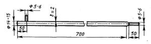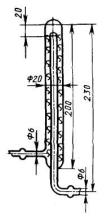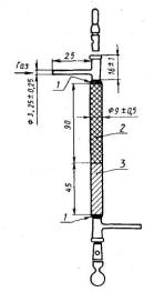 Рисунок 4 - Трубка для оксида меди За реакционной трубкой по ходу аргона расположены: 5.2.2.5. Фильтр для очистки газов разложения от механических загрязнений, заполненный ватой (5.1.8.), высушенной до постоянной массы. Фильтр изготовлен из термостойкого стекла диаметром 22-24 мм длиной 80 мм, концы оттянуты до диаметра 5 мм. 5.2.2.6. Стеклянная трубка типа ТХ-U-2- 100 (или 150) по ГОСТ 25336 для очистки газов разложения от кислых примесей (НС1, H2S и др.), наполненная на 2/3 аскаритом (5.1.4.) и на 1/3 ангидроном (5.1.5.). Ангидрон поглощает воду, выделяющуюся при реакции аскарита с кислыми газами. 5.2.2.7. При анализе топлив с содержанием серы более 4% между фильтром (5.2.2.5.) и трубкой (5.2.2.6.) помещают трубку типа ТХ-U-2-100 (или 150) по ГОСТ 25336, наполненную посеребренной пемзой (5.1.16.) для очистки газов от кислых примесей. 5.2.2.8. Трубка с оксидом меди (рисунок 4). Трубку заполняют оксидом меди в проволоке (5.1.15.) через незапаянную верхнюю часть до выходного отверстия внутренней трубки. После этого верхнюю часть трубки запаивают. У выходного конца помещают слой высушенной ваты. 5.2.2.9. Трубка типа ТХ-U-2-150 (или 200) по ГОСТ 25336 заполненная ангидроном (5.1.5.) для защиты поглотительных сосудов (5.2.3.) от воды, выделяющейся при взаимодействии газов разложения с нагретым оксидом меди в трубке (5.2.2.8.). 5.2.3. Поглотительная система состоит из двух трубок типа ТХ-U-2- 150 (или 200) по ГОСТ 25336 для количественного поглощения диоксида углерода. Трубки заполняют на 2/3 аскаритом (5.1.4.) и на 1/3 ангидроном (5.1.5.) для поглощения воды, выделяющейся при взаимодействии диоксида углерода с аскаритом. Масса поглотительных трубок не должна превышать 110 г. Полнота поглощения диоксида углерода контролируется массой привеса второй (контрольной) трубки, который не должен превышать 1 мг. 5.2.4. Регулятор скорости потока аргона состоит из редуктора на баллоне и игольчатого клапана непосредственно перед очистительной системой, который обеспечивает тонкую регулировку подачи газа. 5.2.5. Лабораторный реометр любого типа для измерения расхода газа в пределах от 40 до 60 см3/мин по ГОСТ 9932, градуированный по вытеканию жидкости. 5.2.6. Трехходовые стеклянные краны по ГОСТ 7995. 5.2.7. П-образная стеклянная трубка диаметром 5-6 мм для обратного хода аргона. Размеры трубки определяют при сборке установки. 5.2.8. Для предотвращения попадания воздуха в систему используют сосуды-барботеры типа СН-1-25, СН-2-25 или СПЖ-50 по ГОСТ 25336, заполненные серной кислотой (5.1.9.) так, чтобы конец внутренней трубки был погружен в кислоту на 20-25 мм. 5.2.9. Весы аналитические с погрешностью взвешивания не более 0,2 мг. 5.2.10. Пробирка стеклянная с пришлифованной пробкой для хранения лодочки с навеской. 5.2.11. Преобразователь термоэлектрический по ГОСТ 3044 (термопара) для измерения температуры до 1200°С с измерительным устройством. 5.2.12. Воронка Бюхнера 2 или 3 по ГОСТ 9147. 5.2.13. Колба для фильтрования под вакуумом типа 1-250 (500) по ГОСТ 25336. 5.2.14. Насос стеклянный водоструйный по ГОСТ 25336. 5.2.15. Аппарат стеклянный для получения газа типа "Аппарат-500 (1000)" по ГОСТ 25336. 5.2.16. Пресс лабораторный для гранулирования сажи с отверстиями во вкладыше диаметром 2 мм. 5.2.17. Склянка 4 или 5-20 (газометр) по ГОСТ 25336. 5.2.18. Крючок из жароупорной проволоки, с помощью которого помещают и извлекают лодочку из реакционной трубки. 5.2.19. Трубки резиновые внутренним диаметром 2-3 мм по ГОСТ 5496. 5.2.20. Палочки стеклянные с оплавленными концами дли