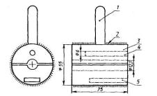 Принципиальная схема установки для определения 1 - безводный перхлорат магния; 2 - смесь гидроксила лития с аскаритом; 3 - оксид фосфора (V) и кусочки стекла; 4 - U-образная трубка; 5 - склянка для подсчета пузырьков. 6 - капилляр диаметром 1 - 1,5 мм; 7 - вазелиновое масло: 8 - кварцевая трубка; 9 - печь, 500ºС; 10 - пористая медь; 11 - вертикальная трубка; 12 - регулятор давления Рисунок 6 - Устройство для очистки азота 6.2.2 Трубка для пиролиза. Трубка для пиролиза внутренним диаметром (10±1) мм изготовлена из чистого, прозрачного кварца без полос и других видимых дефектов. На рисунке 7 представлены две типичные конструкции А и Б входного конца трубки для пиролиза. В конструкции А предусмотрена вспомогательная трубка, которая предотвращает попадание воздуха при внесении в трубку лодочки с навеской. Высушивание и пиролиз навески происходит между патрубком для подачи азота и слоем сажи. Эта часть реакционной трубки должна иметь длину, достаточную для размещения нагревателей, которые используются для высушивания и пиролиза пробы. Съемный нагреватель для высушивания пробы Приведен на рисунке 8. В конструкции Б воздух, попадающий при загрузке пробы, удаляют вместе с влагой до пиролиза пробы. Расстояние между патрубком для подачи азота и колпачком реакционной трубки должно быть достаточным для размещения съемного нагревателя для высушивания пробы, а расстояние между тем же патрубком и слоем сажи - для размещения нагревателя, используемого для пиролиза навески. a - с двумя печами; б - с одной печью; 1 - печь; 2 - съемный нагреватель для высушивания пробы; 3 - лодочка; 4 - отверстие; 5 - вспомогательная трубка; 6 - толкатель с железным сердечником; 7- магнит; 8 - держатель для лодочки (плавленый кварц); 9-- колпачок. Рисунок 7 - Типичные конструкции входного отверстия трубки для пиролиза