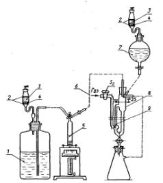 1 - титрант; 2 - стекловата; 3 - аскарит; 4 - ангидрон; 5 - бюретка с поршнем; 6- соединительные трубки из полиэтилена; 7- пиридин; 8 - поглотительный сосуд; 9 - капилляр диаметром 1 мм Рисунок 9 - Аппаратура для поглощения и титрования диоксида углерода