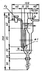 1 - рукоятка из теплоизолирующего материала; 2 - теплоизолирующее покрытие; 3 - материал: алюминий; 4 - кармин для термометра; 5 – паз для электронагревателя Рисунок 8 - Съемный нагреватель для высушивания пробы Пиролиз пробы осуществляют с помощью газовой или электрогорелки, а нагрев сажевого контакта - только электропечью. Превращение кислорода летучих продуктов пиролиза в оксид углерода происходит на чистой (6.1.2.1.) или платинированной (6.1.2.2.) саже. В первом случае длина слоя сажи составляет 190-200 мм. Для фиксации слоя сажи используют пробки из платиновой сетки длиной 5 мм. Печь должна нагревать сажу до (1125±25)°С. При использовании платинированной сажи набивка должна состоять из двух секций длиной по 45-50 мм, разделенных пробками из платиновой сетки длиной 5 мм. Печь должна нагревать платинированную сажу до 940°С, обычно рабочая температура составляет (910±10)°С. За восстанавливающим реагентом (сажей) в обоих случаях помещают пробку из медной сетки (6.1.3.) длиной 50-60 мм, нагреваемую подходящей печью до 900°С. 6.2.3. Трубка для очистки оксида углерода. Трубка длиной 190-210 мм и внутренним диаметром 10-15 мм. 130-140 мм ее длины наполняют смесью гидроксида лития с аскаритом (6.1.4.) для поглощения кислых газов (НСl, H2S и др.), следующие 60-70 мм - перхлоратом магния (6.1.5.) для поглощения воды, выделяющейся при реакции кислых газов с аскаритом. 6.2.4. Трубка для окисления оксида углерода. Трубка длиной 220-250 мм (в зависимости от того, какой из альтернативных реагентов используют), внутренним диаметром (10±1) мм. Трубку заполняют одной из следующих групп реагентов в следующем порядке: а) 15-20 мм хлопковой ваты, пропитанной иодидом калия (6.1.7.); 100-110 мм реагента Шютца (6.1.8.1.); 35-50 мм хлопковой ваты, пропитанной иодидом калия (6.1.7.); 45-50 мм перхлората магния (6.1.5.). Реагенты отделяют друг от друга слоем стеклянной ваты (6.1.6.) длиной 5 мм; б) 130-140 мм ангидроиодноватой кислоты (6.1.8.2.), нагретой до 120°С; 35-40 мм хлопковой ваты, пропитанной иодидом калия (6.1.7.); 40-45 мм перхлората магния (6.1.5.). Реагенты отделяют друг от друга слоем стеклянной ваты (6.1.6.) длиной 5 мм; в) 140-150 мм красного оксида ртути (II) (6.1.8.3.) нагретого до 20°С, удерживаемого пробками из стеклянной ваты длиной 5 мм; пустой промежуток (при комнатной температуре) длиной 45-50 мм для конденсации ртути; 35-40 мм набивки из серебряной проволоки (6.1.9.) для поглощения паров ртути. 6.2.5 Аппаратура для определения диоксида углерода, полученного в трубке для окисления (6.2.4). 6.2.5.1. Титриметрическое окончание Аппаратура для поглощения и титрования диоксида углерода представлена на рисунке 9, поглотительный сосуд - на рисунке 10.