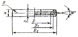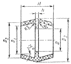 Масса - 0,015 кг Масса - 0,022 кг Черт. 7 Пример условного обозначения манжетообразной прокладки исполнения 1: Прокладка манж. обр. 1 ГОСТ 24188-80 То же, исполнения 2: Прокладка манж. обр. 2 ГОСТ 24188-80 4д. Конструкция и основные размеры конических прокладок для буртовых труб должны соответствовать указанным на черт. 8 и в табл. 7. Черт. 8 Таблица 7 Размеры в мм