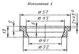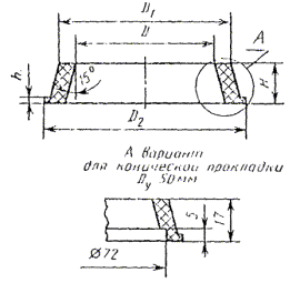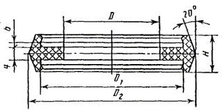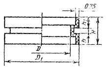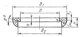 Примечание. Исполнение 1 - прокладка из пищевой резины; Исполнение 2 - прокладка из кислотощелочестойкой резины. Пример условного обозначения муфтообразной прокладки исполнения 1 для трубы Dу = 15 мм: Прокладка М-обр. 1-15 ГОСТ 24188-80 То же, исполнения 2: Прокладка М-обр. 2-15 ГОСТ 24188-80 4в. Конструкция и основные размеры составной прокладки должны соответствовать указанным на черт. 6 и в табл. 6. Черт. 6 Таблица 6 Размеры в мм