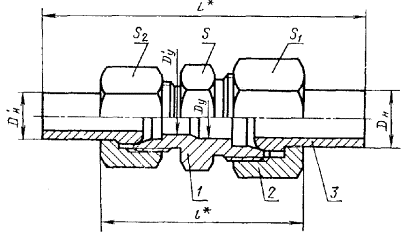 * Размеры для справок 1 - штуцер по ГОСТ 21857-78; 2 - накидная гайка по ГОСТ 23353-78; 3 - шаровой ниппель по ГОСТ 23355-78 Размеры, мм