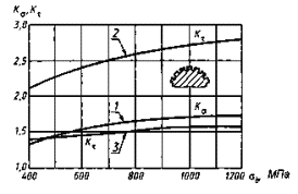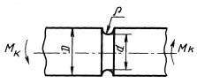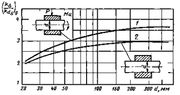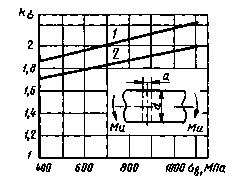 1.2. Определение эффективных коэффициентов концентрации напряжений Кσ, Кτ и отношений Kσ/Kdσ, Kτ/Kdτ1.2.1. Коэффициенты Кσ, Кτ и отношения Kσ/Kdσ, Kτ/Kdτ определяют по экспериментальным данным или путем расчета. 1.2.2. Определение Кσ , Кτ, Kσ/Kdσ и Kτ/Kdτ - по экспериментальным данным. Коэффициенты Кσ, Кτ могут определяться экспериментально на геометрически подобных образцах диаметром d или толщиной h поперечного сечения не менее 40 мм, если d или h рассчитываемой детали превышают это значение. Если d или h рассчитываемой детали меньше 40 мм, то при экспериментальном определении Кσ, Кτ целесообразно вести испытания на натурных деталях или моделях тех же поперечных размеров. Для ряда деталей экспериментально полученные значения Кσ, Кτ и Kσ/Kdσ, Kτ/Kdτ приведены в приложении 2 (черт. 1-7, 13-16). Значения (Kσ/Kdσ)0 для валов с напрессованными деталями (при наличии коррозии трения) при изгибе представлены на черт. 1 приложения 2. При σB > 500 МПа и ρ < 30 МПа следует учитывать соответствующие поправочные