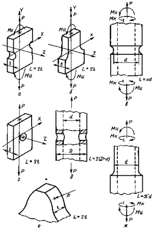 В формуле для определения F(Θ, v) параметр v принимает значения vaσ при изгибе и растяжении-сжатии и vτ - при кручении. 1.6. Определение параметра L1.6.1. При круговом изгибе или растяжении-сжатии, а также при кручении круглых стержней с кольцевыми канавками, с переходом от одного сечения к другому по галтели, с резьбой или гладких L = πd. При изгибе в одной плоскости круглых стержней L = 0,08 πd. Если при растяжении-сжатии или изгибе деталей только часть периметра рабочего сечения прилегает к зоне повышенной напряженности, то L вычисляют по формулам, приведенным на черт. 2 приложения 4. 1.7.
