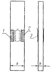 где ΔeI - изменение поперечной относительной деформации образца при изменении нагрузки на ΔF, измеренное по ширине или толщине образца (в зависимости от задания). 6.6. Статистическую обработку результатов испытания проводят по СТ СЭВ 876-78 при доверительной вероятности 0,95. 6.7. Форма протокола испытаний дана в рекомендуемом приложении 4. ПРИЛОЖЕНИЕ 1Рекомендуемое МЕТОД ОПРЕДЕЛЕНИЯ МОДУЛЯ УПРУГОСТИ1. Модуль упругости Е определяют отношением напряжения s к соответствующей относительной деформации e. 2. Метод определения модуля упругости основан на измерении деформации e при трехкратном нагружении-разгружении образца (см. черт. 2 - 4 настоящего стандарта) в заранее выбранном диапазоне нагрузок в пределах начального линейного участка диаграммы. 3. Для измерения деформации используют тензорезисторы, механические тензометры и другие приборы, отвечающие требованиям, указанным в п. 2.4 настоящего стандарта. Тензорезисторы наклеивают в середине образца с двух его сторон в продольном направлении. 4. В качестве регистрирующей аппаратуры применяют осциллографы, измерители статических деформаций типа ИСД-3 потенциометры типа МДС-021 или другие приборы с чувствительностью не ниже 10-5 относительных единиц деформации. 5. Образец устанавливают на испытательной машине и укрепляют на его рабочей части измерители деформаций (тензодатчики наклеивают за 16 - 24 ч до испытаний). 6. Подсоединяют к измерителям деформаций регистрирующую аппаратуру и нагружают образец силой, составляющей 10 - 20 % от кратковременной статической прочности испытываемого материала. Затем уменьшают нагрузку до 2 - 5 % и принимают это состояние за исходное. 7. Образец подвергают при заданной скорости трехкратному нагружению-разгружению до требуемого уровня (15 - 40 % Fmax) и при каждом нагружении считывают показания деформаций при двух нагрузках - начальной, равной 2 - 5 % от величины разрушающей нагрузки Fmax и максимальной. 8. По результатам измерений деформации для каждого нагружения определяют модуль упругости согласно п. 6.4 настоящего стандарта. За результат принимают среднее арифметическое значение всех нагружений. ПРИЛОЖЕНИЕ 2Рекомендуемое МЕТОД ОПРЕДЕЛЕНИЯ КОЭФФИЦИЕНТА ПУАССОНА1. Коэффициент Пуассона ν определяют отношением поперечного относительного укорочения к продольному относительному удлинению при растяжении образца в пределах начального линейного участка диаграммы s ~ e. 2. Метод определения коэффициента Пуассона основан на измерении относительных продольных и поперечных деформаций образца (см. черт. 2 - 4 настоящего стандарта) в процессе непрерывного или ступенчатого статического нагружения его при растяжении. 3. Для измерения деформаций используют тензорезисторы, у которых коэффициент поперечной тензочувствительности или очень мал или равен нулю, электротензометры или механические тензометры. Тензорезисторы наклеивают в середине образца с двух его сторон в продольном 1 и поперечном 2 направлениях (см. чертеж).