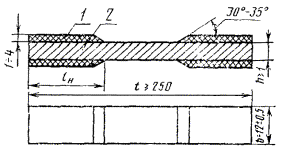 Черт. 1 2.4. Для регистрации деформаций должны использоваться приборы, обеспечивающие измерение деформаций с погрешностью не более 1 % от предельного значения измеряемой величины. Могут быть использованы механические тензометры, тензопреобразователи сопротивления или другие приборы, прикрепление которых не создает дополнительных напряжений или деформаций и не оказывает влияние на определяемые характеристики. 2.5. Приборы для измерения геометрических размеров образца должны обеспечивать измерение с погрешностью не более ±0,05 мм, если измеряемые размеры меньше 10 мм, и ±0,1 мм, если измеряемые размеры больше или равны 10 мм. 3. ОБРАЗЦЫ3.1. Для испытаний однонаправленных композиционных материалов применяют образцы в виде полосы прямоугольного сечения с закрепленными на концах накладками (черт. 2). При определении модулей упругости и коэффициента Пуассона этих материалов могут также использоваться образцы-полоски без накладок (черт. 3). 1 - накладка; 2 - образец Черт. 2 Черт. 3 3.2. Для испытаний композиционных материалов с неоднонаправленной арматурой применяют образцы в виде лопатки, форма и размеры которых приведены на черт. 4. Допускается использование образцов, указанных в п. 3.1. Черт. 4 3.3. Отклонение образцов от номинальных размеров по ширине и толщине рабочей зоны не должно превышать 0,05 мм. 3.4. Расположение арматуры должно быть симметрично относительно срединной плоскости образца, проходящей через его ось и параллельной плоскости укладки арматуры. 3.5. Условия изготовления образцов, механическая обработка, место и направление их вырезки из плит предусматриваются в нормативно-технической документации на композиционные материалы. 3.6. Образцы должны иметь гладкую ровную поверхность без вздутий, сколов, неровностей, надрезов, царапин, трещин или других видимых невооруженным глазом дефектов. 3.7. Накладки для образцов изготовляют из ортогонально армированных стеклопластиков или других материалов, модуль упругости которых в направлениях, перпендикулярных оси образца, не превышает модуль упругости в этих же направлениях материала образца, а относительное удлинение при разрушении накладок не должно быть меньше относительного удлинения испытываемого материала. Направление укладки волокон на прилегающей к образцу поверхности накладок должно совпадать с направлением укладки волокна образца. 3.8. Рекомендуемая длина накладок lн для однонаправленных высокопрочных композитов составляет 90 - 100 мм. 3.9. Накладки при многократном использовании крепятся к образцу с помощью шлифовальной тканевой шкурки по ГОСТ 5009-82, на поверхность полотна которой приклеивают накладки, как указано на черт. 5. Рекомендуется использовать клей БФ-2 по ГОСТ 12172-74 или другие аналогичные по механическим свойствам. Установка накладок на образец указана на черт. 5. 1 - накладка; 2 - шлифовальная шкурка; 3 - образец; 4 - абразивный слой; 5 - слой клея Черт. 5 3.10. В случае разового использования накладок их приклеивают непосредственно к образцу как показано на черт. 2. Для приклейки накладок используют клей. Сдвиговая прочность клея должна составлять не менее 40 МПа. Технология приклейки накладок должна быть указана в нормативно-технической документации на материал образца. 3.11. Количество образцов, необходимое для определения одной из характеристик п. 1.1 в заданном направлении к