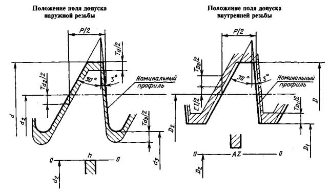 Примечание. Степень точности диаметра d3 должна соответствовать степени точности диаметра d2. 1.5. Положение для допуска диаметра резьбы определяется основным отклонением (верхним отклонением es для наружной резьбы и нижним отклонением EI для внутренней резьбы) и обозначается буквой латинского алфавита, строчной для наружной резьбы и прописной для внутренней. Положения полей допусков приведены на чертеже и в табл. 2. Таблица 2