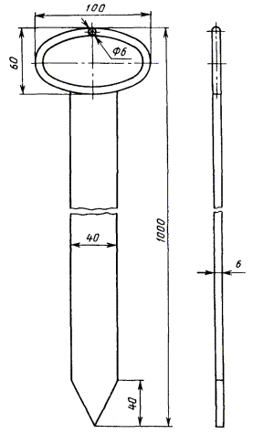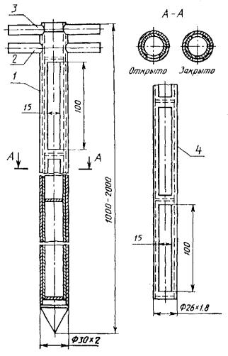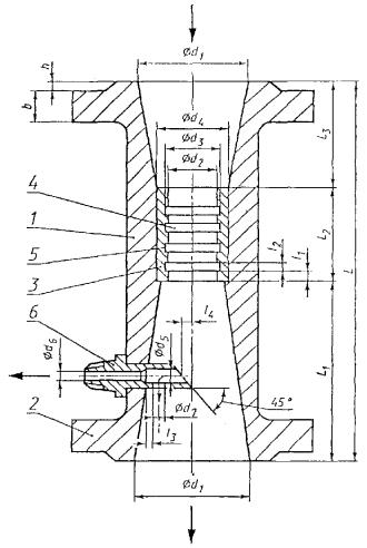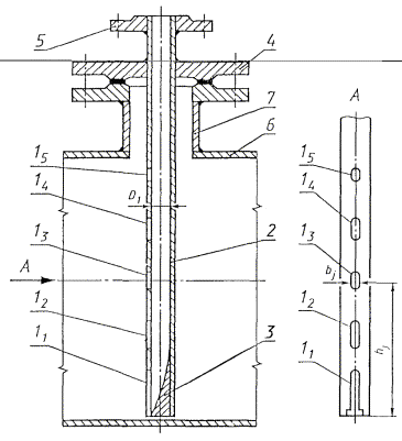 Примечания: 1. Допускаемое отклонение ширины отверстия 1 от расчетной - не более 0,1 мм, высоты: 0,2 мм - при 40 < Dy < 100; 0,4 мм - при 100 < Dy < 350; 0,8 мм - при 350 < Dy < 600; 1,5 мм - при 600 < Dy < 1400. 2. Допускается зазор между нижней точкой пробоотбора и нижней образующей трубопровода не более 5 мм. 3. Участки сопряжения верхних и нижних границ щелевого отверстия с боковыми границами допускается выполнять по линии с радиусом кривизны 0,2 - 1,0 ширины участков сопряжения указанных границ. Таблица 2 - Пробозаборная трубка с пятью отверстиями (черт. 15б) Размеры в миллиметрах