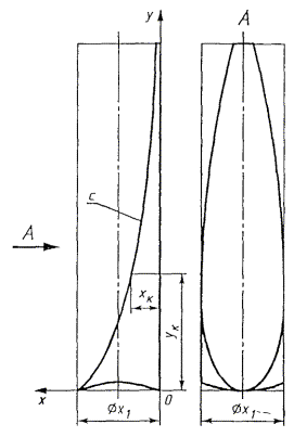 Примечания: 1. Допускается: b = 13 мм при условном давлении в обводной линии не более 1,6 МПа; b = 17 мм при условном давлении в обводной линии не более 4,0 МПа. 2. При диаметре обводной линии менее 40 мм для монтажа диспергатора на обводной линии устанавливают переходы на диаметр равный d1. (Введено дополнительно, Изм. № 1). ПРИЛОЖЕНИЕ 4Обязательное РАСЧЕТ ПАРАМЕТРОВ СТАБИЛИЗАТОРА ЩЕЛЕВОГО ПРОБОЗАБОРНОГО УСТРОЙСТВАПоверхность С стабилизатора (черт. 20) выполняется по точкам, проекция которых на плоскость Оху является параболой второй степени с параметрами хк и ук (k = 1, . . . , 11), мм, определяемыми по формулам: - для трубопровода, условный диаметр Dу которого равен или больше 350 мм: где D1 - внутренний диаметр пробозаборной трубки, мм, индекс k изменяется от 1 до 11; - для трубопровода, условный диаметр Dy которого меньше 350 мм: Примечания: 1. Диаметр D1, пробозаборной трубки выбирают в зависимости от диаметра Dу трубопровода (приложение 2, табл. 1-2). 2. Высота стабилизатора (совпадающая со значением ун) может отличаться от расчетной не более чем на 3 мм. 3. Допуск на шероховатость Rа поверхности С стабилизатора: Ra < 0,1 мм. Пример 1. Рассчитать параметры хк и ук поверхности С стабилизатора при условном диаметре Dу трубопровода равном 700 мм, внутреннем диаметре D1 пробозаборной трубки равном 32 мм. Поскольку Dу > 350 мм, для определения параметров хк и ук пользуемся формулами (1). Результаты расчетов сводим в табл. 1. Таблица 1