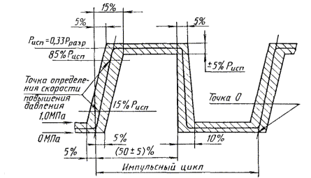 1 - внутренний резиновый слой; 2 - текстильный защитный слой; 3 и 4 - силовые слои с правым направлением навивки; 5 и 6 - силовые слои с левым направлением навивки; 7 - промежуточный резиновый слой; 8 - наружный резиновый слой ПРИЛОЖЕНИЕ 3Обязательное ИМПУЛЬСНЫЙ ЦИКЛ ДИНАМИЧЕСКОГО ИСПЫТАНИЯ РУКАВОВ