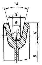 Допускается применять резьбовое коническое соединение. 1 - 3. (Измененная редакция, Изм. № 1). 4. Угол наклона отвода вертлюга от вертикальной оси - не менее 15°. 5. Соединение ниппельного переводника вертлюга с ведущей трубой - резьбовое 3-152Л по ГОСТ 5286. 6. Присоединительные размеры шкивов кронблоков, крюкоблоков и талевых блоков должны соответствовать указанным на черт. 4 и в табл. 3. Н: 1,33 - 1,75 d,. a - угол развала желоба шкива 30° - 50°. Черт. 4 Таблица 3 мм
