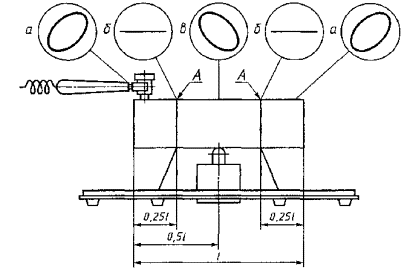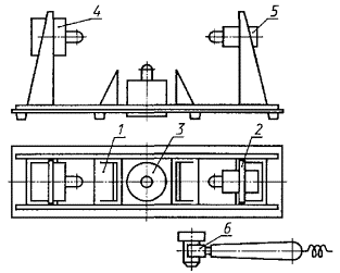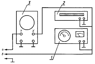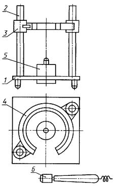 Постановлением Государственного комитета СССР по стандартам от 13 апреля 1983 г. № 1757 дата введения установлена 01.07.84 Настоящий стандарт устанавливает акустический звуковой метод определения открытой пористости, кажущейся плотности, плотности и предела прочности при сжатии огнеупорных изделий. Сущность метода состоит в использовании статистической связи резонансных частот основного тона изгибных или продольных вынужденных механических колебаний огнеупорных изделий с их открытой пористостью, кажущейся плотностью, плотностью и пределом прочности при сжатии, определяемых с помощью уравнений регрессии или номограмм, построенных на их основе. Статистическая связь устанавливается для изделий одной марки, одного типоразмера и одинакового способа изготовления. Стандарт не распространяется на бетонные, безобжиговые, мелкоштучные, фасонные особо сложной конфигурации (кроме сталеразливочных пробок, плит для шиберных затворов), рулонные, листовые, блочные массой свыше 50 кг, пропитанные, оплавленные, кассетированные огнеупорные изделия. Термины, применяемые в стандарте, и их определения приведены в приложении. (Измененная редакция, Изм. № 1). 1. АППАРАТУРАВесы лабораторные общего назначения 4-го класса точности по ГОСТ 24104-88* или весы для статического взвешивания среднего 3-го класса точности по ГОСТ 29329-92. Допускается использовать другие весы, обеспечивающие требуемую точность измерения; * С 1 июля 2002 г. введен в действие ГОСТ 24104-2001. генератор низкочастотный измерительный, генерирующий немодулированные синусоидальные сигналы с нижней границей измеряемых частот не более 0,2 кГц и верхней границей не менее 20,0 кГц с выходным напряжением не менее 30 В; частотомер электронно-счетный с нижней границей измеряемых частот не более 0,01 кГц и верхней границей не менее 100,0 кГц; осциллограф электронно-лучевой с минимальным коэффициентом отклонения не более 2 мВ/см, имеющий вход на усилитель горизонтального отклонения или горизонтальные пластины (используется как индикатор); приемоизлучающие системы (черт. 1, 2) с излучающими и приемными преобразователями, способные возбуждать и регистрировать в контролируемых изделиях механические колебания с нижней границей измеряемых частот не более 0,2 кГц и верхней границей не менее 20,0 кГц. Приемоизлучающая система для изделий нормальных размеров, фасонных простой и сложной конфигурации 1 - раздвижные опоры; 2 - передвижные кронштейны; 3 - излучающий преобразователь для возбуждения в изделиях изгибных колебаний; 4 - излучающий преобразователь для возбуждения в изделиях продольных колебаний; 5 - приемный преобразователь продольных колебаний; 6 - переносной приемный преобразователь Черт. 1 Приемоизлучающая система для сталеразливочных пробок 1 - основание; 2 - колонна; 3 - обойма; 4 - кольцевая опора; 5 - излучающий преобразователь; 6 - приемный преобразователь Черт. 2 Блок-схема соединения радиотехнических приборов для определения резонансной частоты изгибных или продольных колебаний изделия приведена на черт. 3. Блок-схема соединения радиотехнических приборов для определения резонансной частоты изгибных или продольных колебаний изделия 1 - генератор низкочастотный измерительный; 2 - частотомер электронно-счетный; 3 - осциллограф электронно-лучевой; а - к приемному преобразователю; б - к излучающему преобразо