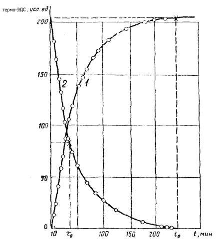 1, 5 - стабилизатор напряжения П-36-11; 2 - потенциометр Р 3003; 3 - нормальный элемент Х 480; 4 - образцовая катушка сопротивления, 10 Ом; 6 - нагреватель калориметра; 7 - миллиамперметр 0 - 50 мА; 6 - магазин сопротивлений Р 4831 (Измененная редакция, Изм. № 1). ПРИЛОЖЕНИЕ 2Справочное Пример кривых нагревания и охлаждения калориметра