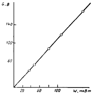 где IH - сила тока нагревателя, А; RH - сопротивление нагревателя, Ом; Wmin, Wmax - нижняя и верхняя границы измеряемого калориметром теплового потока, Вт. Через интервалы времени, равные 4 - 10 мин, снимают показания измерительного прибора в цепи термобатареи калориметра по п. 3.4.3. За время установления теплового равновесия калориметра t0 принимают интервал времени от момента включения тока нагревателя до момента, когда разность между двумя последовательными показаниями измерительного прибора станет менее 0,5 %. Выключают ток нагревателя и повторяют измерения при охлаждении калориметра. Пример кривых нагревания и охлаждения калориметра приведен в справочном приложении 2. (Измененная редакция, Изм. № 1). 3.5.1.2. Чувствительность калориметра устанавливают по градуировочной характеристике, определяющей соотношение между показанием прибора, измеряющего термо-ЭДС в цепи термобатареи, и мощностью источника тепла, его вызывающей. Через нагреватель одного из поглотителей калориметра пропускают ток, сила которого определяется из соотношения (29), и через промежуток времени t0 снимают показания измерительного прибора в цепи термобатареи по п. 3.4.3. Изменяют несколько раз силу тока и повторяют измерения, выдерживая каждый раз интервал времени t0 между моментом изменения силы тока и моментом снятия показаний. По данным измерений строят градуировочную характеристику поглотителя G = f (W), (30) где G - показание измерительного прибора в цепи термобатареи, В; W - тепловой поток, развиваемый в поглотителе нагревателем, Вт, рассчитываемый по формуле W = I2H RH, (31) где RH - сопротивление нагревателя, Ом; IH - сила тока, пропускаемого через нагреватель поглотителя, измеряемая при помощи потенциометрического устройства по схеме рекомендуемого приложения 1, А. Если зависимость (30) является линейной в диапазоне от Wmin до Wmax, вычисляют чувствительность первого поглотителя калориметра по формуле