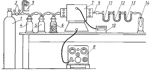 1 - баллон с кислородом; 2 - клапаны для снижения давления; 3 - манометр; 4 - склянка со стеклянной ватой; 5 - склянка с кольцами Рамига и серной кислотой; 6 - склянка, на 2/3 заполненная натронной известью и на 1/3 силикагелем, и прокладками из стеклянной ваты; 7 - трубчатая печь с электрическим нагревом; 8 - регулировочный трансформатор; 9 - газонепроницаемая керамическая трубка длиной не менее 800 мм и внутренним диаметром не менее 18 мм; 10 - прибор для измерения температуры; 11 - U-образная трубка, заполненная силикагелем; 12 - U-образная трубка, на 2/3 заполненная силикагелем и на 1/3 натронной известью, с прокладками из стеклянной ваты; 13 - U-образная трубка, на 2/3 заполненная натронной известью и на 1/3 силикагелем, с прокладками из стеклянной ваты; 14 - счетчик пузырьков Далее трубки вновь присоединяют к системе, лодочку с пробой помещают в рабочую зону и через систему пропускают кислород со скоростью, позволяющей отсчитывать количество пузырьков с помощью счетчика (около 100 см3/мин), при этом поддерживают температуру (730 ± 20) °С в течение 1 ч 15 мин, затем U-образные трубки 12 и 13 снимают, охлаждают в эксикаторе и вновь взвешивают. 2.4. Обработка результатов 2.4.1. Массовую долю свободного углерода (X) в процентах вычисляют по формуле