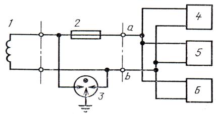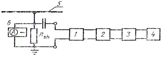 предохранитель; 3-трехэлектродный разрядник защиты от перенапряжений; 2.3.3. Проведение измерения Необходимо провести многократные измерения на частоте каждой гармонической составляющей. 2.3.4. Обработка результатов По измеренным значениям каждой гармонической составляющей нужно построить график функции распределения. За искомую величину следует принимать величину гармонической составляющей, соответствующую значению 0,9 функции распределения аналогично п. 2.1.4.2. 2.4. Измерение гармонических составляющих тока в одном проводе системы трехфазного переменного тока 2.4.1. Общие положения Общие положения - по п. 2.3.1. 2.4.2. Аппаратура Измерения следует проводить по схеме, приведенной на черт. 4.