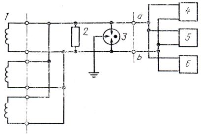 где hmi - абсолютная суммарная численность; п - общее количество зарегистрированных численностей. Допускается определять эквивалентный мешающий ток путем пересчета измеренного псофометрического влияющего тока. 2.2. Измерение эквивалентного мешающего напряжения USS Измерения следует проводить аналогично п. 2.1. 2.3. Измерение гармонических составляющих напряжения в проводе системы трехфазного переменного тока относительно земли 2.3.1. Общие положения 2.3.1.1. При перегрузке приборов током основной частоты необходимо подключить фильтр верхних частот. 2.3.1.2. Допускается на входе измерительных приборов включать делитель напряжения. 2.3.1.3. Подключение отдельных приборов не должно влиять на показания других приборов. 2.3.1.4. При несимметричном входе любого из измерительных приборов следует использовать симметрирующий трансформатор. 2.3.1.5. Приборы должны иметь достаточно высокое входное сопротивление и соответствующую частотную характеристику. 2.3.1.6. Для защиты измерительных приборов допускается использовать разрядник. 2.3.2. Аппаратура Измерения следует проводить по схеме, приведенной на черт. 3,