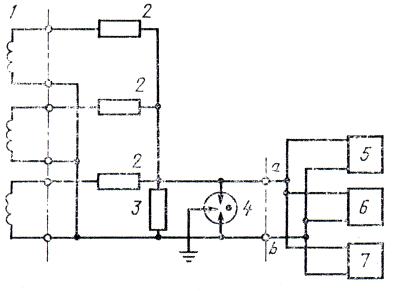 1 - преобразователь тока; 2 - предохранитель; 3 – двухэлектродный разрядник с дренажной катушкой; 4 - измерительный резистор; 5 - селективный вольтметр (анализатор гармоник); 6 - вольтметр для измерения эффективных значений; 7 - псофометр 2.4.3. Проведение измерения Измерения следует проводить по п. 2.3.3. 2.4.4. Обработка результатов Обработка результатов - по п. 2.3.4. 2.5. Непосредственное измерение гармонических составляющих тока в нейтрали 2.5.1. Общие положения Общие положения - по п. 2.3.1. Непосредственное измерение следует проводить на трансформаторной подстанции. 2.5.2. Аппаратура Измерение абсолютных значений гармонических составляющих тока в нейтрали необходимо проводить по схеме, приведенной на черт. 5, а измерение относительных значений - по схеме, приведенной на черт. 6. 2.5.3. Проведение измерения Измерения следует проводить по п. 2.3.3. 2.5.4. Обработка результатов Обработка результатов - по п. 2.3.4.