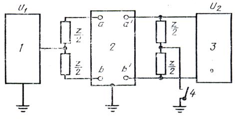 внутренним сопротивлением; 2 - измеряемый объект; 2.11.3. Проведение измерения При выключенном выключателе следует измерять поперечную несимметрию, а при включенном выключателе - продольную несимметрию, считывая напряжения генератора U1 и вольтметра U2 (В). 2.11.4. Обработка результатов 2.11.4.1. Коэффициент несимметрии (gu) следует вычислять по формуле