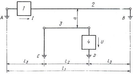 тока; 2 - развернутая линия питания длиной l1; 3 - развернутая измерительная цепь