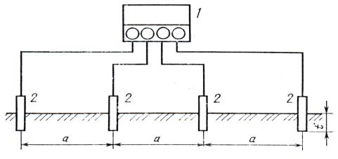 сопротивления заземления; 2 - стержни заземления 2.13.3. Проведение измерения Метод Венера Измерения следует проводить по схеме, приведенной на черт. 17. Четыре стержня заземления вбивают в землю на глубину от 0,1 до 0,15 м по прямой линии с равномерным расстоянием. При измерениях вблизи подземных металлических сооружений электроды следует располагать в соответствии с черт. 18.