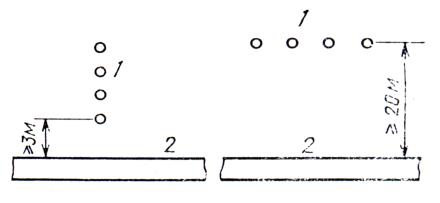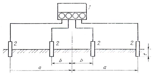 сопротивления заземления; 2 - стержни заземления (измерительные электроды); Величины а и b необходимо определять из табл. 2. При измерениях вблизи подземных металлических сооружений электроды следует располагать в соответствии с черт. 20.