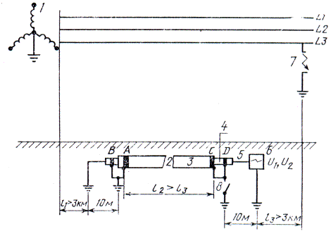 1 - воздушная линия высокого напряжения в сети с глухим заземлением нейтрали; 2 - кабель связи; 3 - броня; 4 - оболочка; 5 - жила; 6 - осциллограф; 7 - место короткого замыкания на землю; 8 - выключатель; L1, L2, L3 - провода системы трехфазного переменного тока; А, В, С, D - кольцевые электроды, припаянные к оболочке и к броне; l1 - участок между питающим трансформатором и измеряемым кабелем; l2 - длина измерительного участка; l3 - участок между местом измерения и местом короткого замыкания на землю