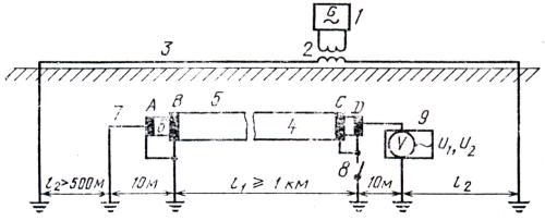 1 - генератор; 2 - согласующий трансформатор; 3 - цепь питания; 4 - кабель связи; 5 - броня; 6-оболочка; 7 - жила; 8 - выключатель; 9 - селективный вольтметр; l1 - длина измерительного участка; l2 - участки между концами измерительного участка и концами искусственной влияющей цепи; А, В, С, D - кольцевые электроды, которые припаяны к оболочке и броне