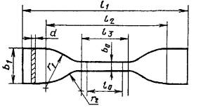 Дата введения 01.01.78 Настоящий стандарт распространяется на резину и устанавливает метод определения упруго-прочностных свойств при растяжении по показателям: прочности при растяжении, относительному удлинению при разрыве, напряжению при заданном удлинении. Сущность метода заключается в растяжении образцов с постоянной скоростью до разрыва и измерении силы при заданных удлинениях и в момент разрыва и удлинения образца в момент разрыва. (Измененная редакция, Изм. № 2). 1. МЕТОД ОТБОРА ОБРАЗЦОВ1.1. Образцы для испытания должны иметь форму двусторонней лопатки или кольца. Форму и тип образца, а также способ изготовления указывают в нормативно-технической документации на изделие. 1.2. Типы и размеры образцов двусторонних лопаток должны соответствовать чертежу и таблице.