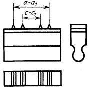 Размеры образцов, кроме толщины, определяются размерами штанцевых ножей и после вырубки не контролируются. Предельные отклонения даны для штанцевых ножей. Образцы типа VII применяют, если из изделий нельзя вырубить образцы типов I-V. Образцы из готовых изделий могут иметь толщину не более 3 мм. (Измененная редакция, Изм. № 1, 2). 1.3. Образцы вырубают из вулканизованных пластин толщиной (1,0 ± 0,2) мм или (2,0 ± 0,2) мм ножами. Форма ножа и угол заточки режущей кромки даны в приложении 1. Вырубные ножи не должны иметь повреждений на режущей кромке. (Измененная редакция, Изм. № 2). 1.4. Разность между максимальной и минимальной шириной ножа в пределах узкой части не должна превышать 0,05 мм. 1.5. Разность между максимальной и минимальной толщиной образца в узкой части не должна превышать 0,1 мм. 1.6. На узкую часть образца наносят параллельные метки для измерения удлинения. Метки в виде линий наносят штампом с шириной кромок не более 0,5 мм. Схема штампа дана в приложении 1. 1.4-1.6. (Измененная редакция, Изм. № 1). 1.7. Для обеспечения одинаковой установки образцов в захватах допускается наносить установочные метки, расстояние между которыми для образцов типов I и II составляет (50 ± 1) мм, для типа III - (40 ± 1) мм, для типа IV - (25 ± 1) мм, для типа V - (80 ± 1) мм, для типа VII - (20 ± 1) мм. (Измененная редакция, Изм. № 1, 2). 1.8. Метки должны быть нанесены симметрично относительно центра образца. Краска для нанесения меток не должна вызывать изменения свойств резин, влияющих на результаты испытаний. Допускается наносить метки другим способом. 1.9. Для лучшего закрепления образцов в захватах применяют образцы с наплывами. Форма и размеры пластин для вырубки таких образцов даны в приложении 1. Наплывы должны быть расположены симметрично относительно центра образца. 1.10. Образцы заготавливают в соответствии с ГОСТ 269. Допускаемое отклонение от заданного значения по ширине кольца не должно быть более ±0,02 мм. 1.12. Толщина образцов должна быть (4,0 ± 0,2) мм или (6,0 ± 0,3) мм. 1.11; 1.12. (Измененная редакция, Изм. № 1). 1.12а. Кольцевой образец для испытания должен быть внутренним диаметром (8,0 ± 0,1) мм, наружным диаметром (10,0 ± 0,1) мм и толщиной (1,0 ± 0,1) мм. (Введен дополнительно, Изм. № 3). 1.13. Образцы вырубают из пластин штанцевыми ножами или вырезают на машинах с вращающимися ножами. Схема штанцевого ножа для вырубки кольцевых образцов дана в приложении 1. Допускается заготовка колец вулканизацией в пресс-формах, обеспечивающих размеры по пп. 1.11, 1.12. При этом результаты испытаний колец, вырубленных или вырезанных и свулканизованных в пресс-формах, не сопоставимы. 1.14. Количество испытуемых образцов должно быть не менее пяти. 2. АППАРАТУРА2.1. Машина для испытания должна обеспечивать: измерение силы при заданных удлинениях и в момент разрыва с погрешностью измерения силы при прямом ходе (нагружении) не более ±1 % от измеряемой силы, начиная с 0,2 от наибольшего предельного значения каждого диапазона измерения; ход активного захвата не менее 1000 мм; скорость движения активного захвата (500 ± 50) и (1000 ± 50) мм/мин; измерение расстояния между метками и захватами при растяжении образца устройством с ценой деления шкалы не более 1 мм или градуированным в процентах относительного удлинения. Допускаются другие способы измерения удлинения образцов. (Измененная редакция, Изм. № 1, 2). 2.2. Предпочтительнее машины с безынерционным силоизмерите