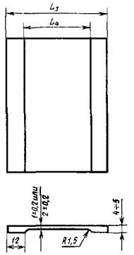 где т - масса образца, г, определенная с погрешностью взвешивания не более 0,01 г; r - плотность резины, определенная по ГОСТ 267, г/см3; lср - длина средней окружности кольца с размерами, указанными в п. 1.11, составляющая p×4,86 » 15,2 см. 4. ПРОВЕДЕНИЕ ИСПЫТАНИЯ4.1. Испытания проводят при температуре (23±2) °С и скорости движения активного захвата (500 ± 50) мм/мин. Допускается проводить испытания при повышенных температурах рекомендуемого ряда: 70 ± 2; 100 ± 2; 125 ± 2; 150 ± 2; 200 ± 3; 250 ± 5°С. Рекомендуется испытания образцов типа V проводить со скоростью движения активного захвата (1000 ± 50) мм/мин. (Измененная редакция, Изм. № 2). 4.2. Образец в форме лопатки закрепляют в захватах машины по установочным меткам так, чтобы ось образца совпадала с направлением растяжения. При испытании образцов с наплывами их закрепляют в захватах по краям наплывов. Образец кольцо надевают на два сближенных ролика. Примечание. При работе с самоподжимающими зажимами с валиками образец лопатку закрепляют таким образом, чтобы установочные метки находились посередине наружной стороны поджимающих валиков. (Измененная редакция, Изм. № 1). 4.3. Проверяют нулевые установки приборов, измеряющих силу и удлинение, и приводят в действие механизм растяжения. В ходе непрерывного растяжения образца фиксируют силу, соответствующую заданным удлинениям. 4.4. В момент разрыва образца фиксируют силу и расстояние между метками для образцов лопаток или расстояние между центрами роликов для образцов колец. Для образцов лопаток типа I допускается измерение расстояния между захватами при отсутствии выползания из них образца при растяжении. При этом относительное удлинение вычисляют по п. 5.3. (Измененная редакция, Изм. № 1). 4.5. Для образцов лопаток типов I, II, V с наплывами допускается измерение расстояния между наплывами при условии применения зажимов, приведенных в приложении 1. (Измененная редакция, Изм. № 2). 4.6. При установке образцов в зажиме необходимо следить за тем, чтобы наплыв плотно прилегал к поворотной пластинке зажима в соответствии с приложением 1. 4.7. При разрыве образца за пределами узкой части результаты испытаний не учитывают. (Измененная редакция, Изм. № 1). 4.8. При необходимости определения относительной остаточной деформации после разрыва измерение и вычисление результатов проводят по приложению 2. (Измененная редакция, Изм. № 2). 4.9. Для испытания при повышенной температуре в камере температуру доводят до заданной, устанавливают в камеру образец и прогревают образцы лопатки не менее 3 мин, а образцы кольца не менее 5 мин. Допускается прогревать в камере одновременно несколько образцов, при этом время прогрева образцов не должно превышать 15 мин. (Измененная редакция, Изм. № 1, 2). 5. ОБРАБОТКА РЕЗУЛЬТАТОВ5.1. Прочность при растяжении выражают условным и истинным значениями, указанными ниже. 5.1.1. Условную прочность (fр) в МПа (кгс/см2) образцов лопаток вычисляют по формуле