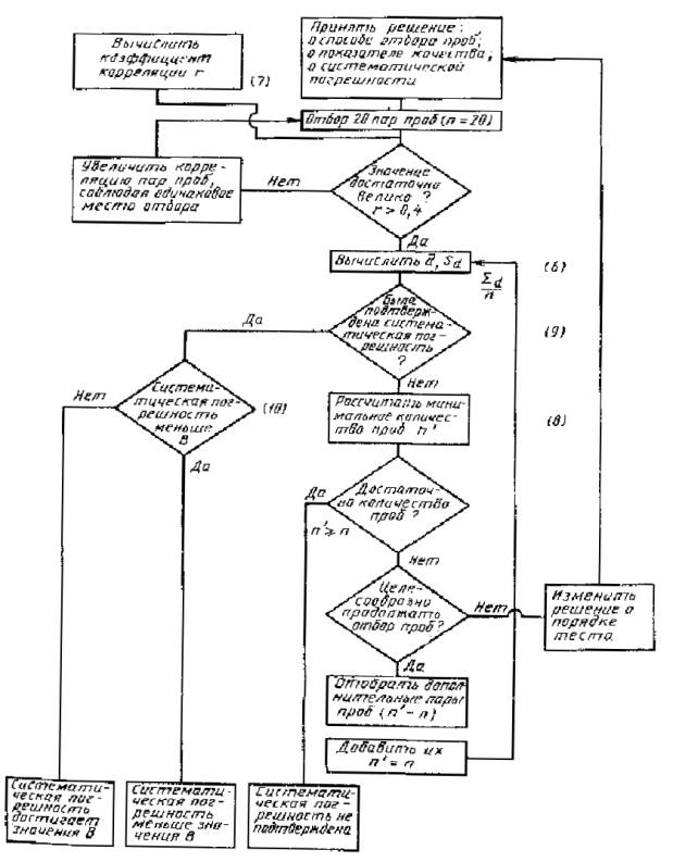 Схема алгоритма определения систематической погрешности пробоотбора, указанная на черт. 1, содержит все альтернативы, с которыми можно встретиться. В скобках приведенные цифры - ссылки на формулы, встречающиеся в тексте. Пример определения наличия систематической погрешности В при отборе проб топлива приведен в п. 4 приложения. Черт. 1 5. МЕТОД ОПРЕДЕЛЕНИЯ ПОГРЕШНОСТИ ПОДГОТОВКИ ПРОБ5.1. Сущность метода Результаты, полученные при подготовке 10 объединенных проб, оценивают математическо-статистическими методами, и величина установленной погрешности, возникающей на отдельных стадиях подготовки проб, выражается величиной дисперсии. 5.2. Проведение испытания 5.2.1. Дисперсия для самых неоднородных по качеству типов топлива не должна превышать в процессе подготовки величины 0,04 Р2 (т.е. по 0,02 Р2 на каждой стадии сокращения при двухстадийной подготовке) и величины 0,01 Р2 при аналитическом определении показателя качества. Таким образом общая дисперсия не должна быть больше 0,05 Р2, где Р2 - базовая погрешность. при