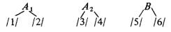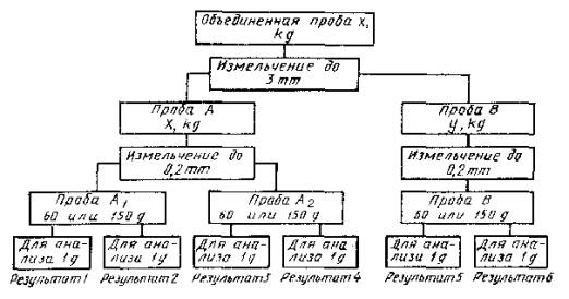 Среднее расхождение результатов 10 пар Черт. 2 Если результаты двух последующих рядов 10 дубликатных проб находятся в указанных пределах, можно предполагать, что подготовка проб производится удовлетворительно. Если среднее расхождение более 0,37 Р, дисперсия является большой, т.е. масса проб непригодна для каждой стадии сокращения. Поэтому необходимо определить дисперсии, возникающие на каждой стадии по п. 5.2.3, с последующим изменением порядка. 5.2.3. Контроль отдельных стадий подготовки проб приведен на черт. 3. Для получения двух проб на каждой стадии сокращения используют делители или механические сократители. При использовании для сокращения делителей сначала производят перемешивание пробы обычным способом, а затем деление пробы делителем для получения пробы A. Остатки накапливают и процесс повторяют, чтобы получить пробу B. Черт. 3 При использовании механических сократителей сократитель устанавливают так, чтобы отсеченные пробы поступали в два сборника, а остаток материала удалялся. Если конструкция сократителя позволяет отбирать только одну пробу в один прием, то после ее отбора оставшуюся часть снова пропускают через сократитель и отбирают вторую пробу такой же массы. Этим способом подготавливают 10 проб и получают 10 серий с шестью результатами. При подготовке проб могут быть следующие погрешности: 1) при отборе у kg из X kg - дисперсия V1; 2) при отборе 60 - 150 g из у kg - дисперсия V2; 3) при отборе навески 1 g из пробы, измельченной до 0,2 mm - дисперсия V3. Общая дисперсия подготовки проб составит V = V1 + V2 + V3. 5.2.4. Для каждой из 10 проб получают шесть результатов, обозначенных цифрами от 1 до 6 на черт. 3.