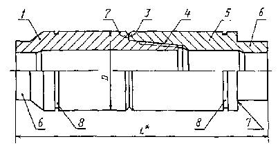 Дата введения 1997-01-01 1. ОБЛАСТЬ ПРИМЕНЕНИЯНастоящий стандарт распространяется на замки приварные для бурильных труб (далее - замки), изготовляемые в климатическом исполнении У категории 1 по ГОСТ 15150. Обязательные требования к качеству приварных замков, обеспечивающие безопасность для жизни, здоровья и имущества населения, окружающей среды, изложены в разделах 3, 4 и 6. Стандарт может быть использован при сертификации замков. 2. НОРМАТИВНЫЕ ССЫЛКИВ настоящем стандарте использованы ссылки на следующие стандарты: ГОСТ 9.014-78 ЕСЗКС. Временная противокоррозионная защита изделий. Общие требования ГОСТ 9.302-88 ЕСЗКС. Покрытия металлические и неметаллические неорганические. Методы контроля ГОСТ 9.306-85 ЕСЗКС. Покрытия металлические и неметаллические неорганические. Обозначения ГОСТ 26.008-85 Шрифты для надписей, наносимых методом гравирования. Исполнительные размеры ГОСТ 4543-71 Прокат из легированной конструкционной стали. Технические условия ГОСТ 8867-89 Калибры для замковой резьбы. Виды. Основные размеры и допуски ГОСТ 9012-59 Металлы. Метод измерения твердости по Бринеллю ГОСТ 9454-78 Металлы. Метод испытания на ударный изгиб при пониженных, комнатной и повышенных температурах ГОСТ 10006-80 Трубы металлические. Метод испытания на растяжение ГОСТ 10354-82 Пленка полиэтиленовая. Технические условия ГОСТ 10877-76 Масло консервационное К-17. Технические требования ГОСТ 15160-69 Машины, приборы и другие технические изделия. Исполнения для различных климатических районов. Категории, условия эксплуатации, хранения и транспортирования в части воздействия климатических факторов внешней среды ГОСТ 28487-90 Резьба коническая замковая для элементов бурильных колонн. Профиль. Размеры. Допуски ГОСТ Р 50278-92 Трубы бурильные с приваренными замками. Технические условия 3. ОСНОВНЫЕ ПАРАМЕТРЫ И РАЗМЕРЫ3.1. Габаритные размеры и масса замков, их применяемость с бурильными трубами должны соответствовать указанным на рисунке 1 и в таблице 1. * Размер для справок. 1 - ниппель; 2 - опорный уступ ниппеля; 3 - упорный торец муфты; 4 - замковая резьба; 5 - муфта; 6 - хвостовик; 7 - заплечик под элеватор; 8 - опознавательный поясок замка с левой резьбой; D - наружный диаметр; L - длина замка в сборе Рисунок 13.2. Замки должны изготовляться с правой и левой замковыми резьбами. 3.3. Размеры ниппелей и муфт замков должны соответствовать указанным на рисунках 2 и 3 и в таблице 2. 3.4. Муфты замков должны изготовляться с прямоугольными и коническими заплечиками под элеватор (вариант рисунка 3). 3.5. Условное обозначение замка должно включать: обозначение типоразмера замка по таблице 1; группу прочности и толщину стенки (ее округленное до целого числа значение) трубы, для которой предназначен замок; обозначение настоящего стандарта. Для замков с коническим заплечиком под элеватор после обозначения толщины стенки трубы ставят букву К, для замков с левой резьбой после сокращенного названия замка ставят букву Л. Пример условного обозначения замка с наружным диаметром 133,4 мм диаметром проходного отверстия 70,6 мм для трубы группы прочности Д с толщиной стенки 8,38 мм с прямоугольным заплечиком под элеватор и правой замковой резьбой: ЗП-133-71-Д-8 ГОСТ 27834-95 то же с левой замковой резьбой: ЗПЛ-133-71-Д-8 ГОСТ 27834-95 то же с коническим заплечиком под элеватор и правой замковой резьбой: ЗП-133-71-Д-8К ГОСТ 27834-95 Таблица 1