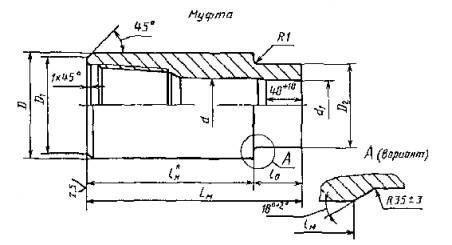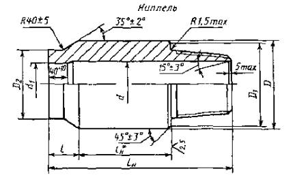 * Для справок. Примечания 1 Цифры 1 и 2 обозначают замки с различными диаметрами хвостовиков D2 (рисунки 2 и 3). 2 В обозначение типоразмера бурильной трубы входит тип высадки: ПВ - внутренняя, ПН - наружная, ПК - комбинированная, наружный диаметр, толщина стенки, округленная до целого числа. D - наружный диаметр; D1 - наружный диаметр упорного уступа; D2 - наружный диаметр хвостовика; d - внутренний диаметр замка; d1 - внутренний диаметр хвостовика; Lн - общая длина ниппеля; l - длина хвостовика; lн - длина ниппеля под ключ Рисунок 2 Lм – общая длина муфты; lм - длина муфты под ключ; l0 - длина хвостовика; R1 - радиус галтели заплечика; D1 - наружный диаметр упорного торца Рисунок 3 Таблица 2