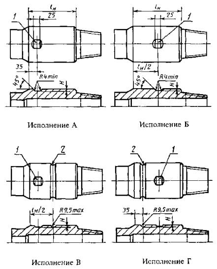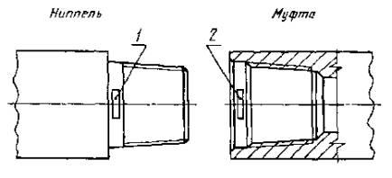 * Для справок. Примечание - Переход с d1 на d не регламентируется. 4. ТЕХНИЧЕСКИЕ ТРЕБОВАНИЯ4.1. Замки приварные для бурильных труб должны изготовляться в соответствии с требованиями настоящего стандарта по технической документации, утвержденной в установленном порядке. 4.2. Замки изготовляют из стали 40ХМФА по ГОСТ 4543 со следующими механическими свойствами после термообработки: Временное сопротивление sв, МПа (кгс/мм2), не менее................................ 981 (100) Предел текучести sт, МПа (кгс/мм2), не менее................................................. 832 (85) Относительное удлинение δs %, не менее....................................................... 13 Относительное сужение, ψ, %, не менее......................................................... 50 Ударная вязкость KCV, кДж/м2 (кгс/см2), не менее......................................... 589 (6) или KCU, кДж/м2 (кгс/см2), не менее................................................................ 883 (9) Твердость по Бринеллю, НВ............................................................................. 300 … 355 Допускается изготовление замков из других марок сталей с механическими свойствами не ниже указанных, обладающих хорошей свариваемостью с материалом бурильных труб. 4.3. Форма и размеры профиля замковой резьбы (правой и левой), предельные отклонения параметров резьбы по ГОСТ 28487. 4.4. Размеры замковых соединений и предельные отклонения основных размеров по ГОСТ 28487. 4.5. Допуски перпендикулярности и плоскостности упорных уступов ниппелей и упорных торцов муфт должны соответствовать указанным в ГОСТ 28487. 4.6. Допуск соосности оси базовой наружной поверхности ниппеля (муфты) должен быть не более, мм: 0,6 - с осью замковой резьбы в плоскости упорного уступа (торца); 1,75 - на длине 1 м; 0,4 - с осью циркулярного канала и внутренней поверхности со стороны торца хвостовика и с осью наружной поверхности хвостовика со стороны торца хвостовика. 4.9. Резьбы ниппелей и муфт, а также упорные уступы и упорные торцы замков должны быть фосфатированы по ГОСТ 9.306. Допускается по требованию потребителя защита резьбы ниппелей и муфт и их упорных поверхностей поликомпозиционными материалами на основе меди. 4.13. Маркировка наносится на каждый ниппель и муфту замка четко клеймами шрифтом 6-Пр3 или 8-Пр3 по ГОСТ 26.008. 4.14. На наружной поверхности ниппеля наносится маркировка, содержащая обозначение типоразмера замка (таблица 1), в которую входит: - округленное значение наружного диаметра D; - округленное значение внутреннего диаметра d; - вариант исполнения 1 или 2 в зависимости от наружного диаметра хвостовика D2. На поверхности конуса ниппеля за сбегом резьбы (рисунок 4) наносится следующая маркировка: - товарный знак или шифр предприятия-изготовителя; - дата выпуска замка (месяц - цифры с 1 по 12, год - две последние цифры года); - группа (или группы) прочности трубы, для которой предназначен замок. 4.15. На наружной поверхности муфты наносится маркировка, содержащая обозначение типоразмера замка: - округленное значение наружного диаметра D - округленное значение внутреннего диаметра d; - вариант исполнения 1 или 2 в зависимости от наружного диаметра хвостовика D2; - дата выпуска замка (месяц - цифры с 1 по 12, год - две последние цифры года); - группа (или группы) прочности трубы, для которой предназначен замок. На поверхности расточки муфты (рисунок 4) наносится товарный знак или шифр предприятия-изготовителя. 1 - место клеймения ниппеля: товарный знак, дата выпуска, группа прочности трубы; 2 - место клеймения муфты: товарный знак