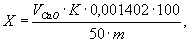 где VCaO - объем раствора трилона Б, израсходованный на титрование анализируемой пробы при определении оксида кальция, см3; К - коэффициент молярности раствора трилона Б концентрации с (1/2Na2 ЭДТА) = 0,05 моль/дм3; 250 - объем раствора соляной кислоты концентрации 0,2 моль/дм3, приливаемый к навеске исследуемого материала, см3; 0,001402 - масса оксида кальция, соответствующая 1 см3 раствора трилона Б точной концентрации c (1/2Na2 ЭДТА) = 0,05 моль/дм3, г; 50 - объем фильтрата, взятый для титрования, см3; т - масса навески торфа или торфяной продукции, г. 5.2. Массовую долю оксида магния (Х) в процентах при натуральной влаге вычисляют по формуле