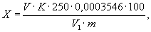 где V - объем раствора азотнокислого серебра концентрации 0,01 моль/дм3 (0,01 н), израсходованный на титрование анализируемой пробы, см3; K - коэффициент молярности раствора азотнокислого серебра концентрации с (AgNO3) = 0,01 моль/дм3 (0,01 н); 250 - объем дистиллированной воды, приливаемый к навеске исследуемого материала, см3; 0,0003546 - масса хлор - ионов С1-, соответствующая 1 см3 раствора азотнокислого серебра с концентрацией точно 0,01 моль/дм3, г; V1 - объем вытяжки, взятый на титрование, см3; т - масса навески торфа или торфяной продукции, г. 5.2. Массовую долю хлора (X1) в процентах в пересчете на сухое вещество вычисляют по формуле