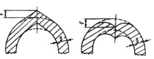 5.5.41. Допускаемые отклонения размеров в выпуклых днищах: отклонения заданной формы выпуклой части, контролируемой шаблонами, - не более 1,25 % внутреннего диаметра днища при внутреннем диаметре более 500 мм и не более 5 мм при внутреннем диаметре 500 мм и менее; утонения стенки, вызываемые вытяжкой при штамповке, - не более 10 % номинальной толщины стенки, если допустимость большего утонения не предусмотрена расчетом на прочность; наружного и внутреннего диаметров - ±1 % номинального диаметра по разности между максимальным и минимальным значениями диаметров, измеренных в одном сечении цилиндрического борта; овальности поперечного сечения цилиндрического борта днища - не более 1 %. 5.5.42. Отклонения по диаметру и овальности поперечного сечения деталей, изготавливаемых из труб, не должны превышать значений, установленных п. 5.5.39 настоящих Правил. 5.5.43. Контроль толщины стенки гнутых участков труб следует проводить с помощью ультразвукового толщиномера или измерением после разрезки. Методика, порядок и объем контроля толщины стенки гнутых участков труб устанавливаются ПТД. 5.5.44. В стыковых сварных соединениях элементов оборудования и трубопроводов с одинаковой номинальной толщиной стенки смещение (несовпадение) кромок свариваемых элементов (деталей) с наружной стороны шва не должно превышать значений, указанных в табл. 3. Таблица 3