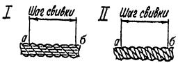 Рис. П2.1. Канаты различной свивки: I - крестовой; II - односторонней На дорогах с малым углом наклона, когда при обрыве тягового каната вагон не может дойти самокатом до нижней станции, нормы браковки каната, приведенные в табл. П2.1, удваиваются. 2. Шаг свивки каната определяют следующим образом. На поверхности какой-либо пряди (рис. П2.1) наносят метку "а", от которой отсчитывают вдоль оси каната столько прядей, сколько их имеется в сечении каната (например, шесть в шестирядном канате), и на следующей после отсчета пряди (в данном случае на седьмой) наносят вторую метку "б". У многопрядных канатов пряди отсчитывают, исходя из числа прядей в наружном слое. 3. Браковка каната, изготовленного из проволок различного диаметра, конструкции 6х19=114 проволок с одним органическим сердечником производится согласно данным, приведенным в первой графе табл. П2.1, причем число обрывов как норма браковки принимается за условное. При подсчете обрывов обрыв тонкой проволоки принимается за 1, а обрыв толстой проволоки - за 1,7. Например, если на длине одного шага крестовой свивки каната имеются три обрыва тонких и два обрыва толстых проволок, то условное число обрывов составляет 3х1+2х1,7=6,4, т.е. 6 (табл. П2.1) и, следовательно, канат должен быть забракован. При наличии обрыва даже одной проволоки каната в зоне крепления его в муфте канат должен быть забракован. 4. Число проволок на одном шаге свивки как признак браковки каната, конструкция которого не указана в табл. П2.1, определяется исходя из данных, помещенных в этой таблице для каната, ближайшего по числу прядей и числу проволок в сечении. Например, для каната конструкции 8х19=152 с одним органическим сердечником, ближайшим по табл. П2.1, является канат 6х19=114 с одним органическим сердечником. Для определения признака браковки следует данные табл. П2.1 (число обрывов на одном шаге свивки) для каната 6х19=114 с одним органическим сердечником умножить на коэффициент 1,33 (96:72=1,33), где 96 и 72 - число проволок в наружных слоях прядей одного и другого канатов. Число проволок в наружных слоях прядей берется из соответствующего ГОСТа или определяется подсчетом непосредственно на канате. 5. При наличии у каната поверхностного износа или коррозии проволок число обрывов на шаге свивки как признак браковки должно быть уменьшено в соответствии с данными, приведенными ниже: