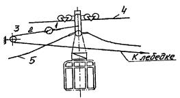 Паспорт должен включать исполнительные чертежи: продольного профиля трассы дороги; плана и размеров станций; общего вида опор, привода, подвижного состава; принципиальной электрической схемы управления ППКД, включая цепи сигнализации и освещения, а также указания по заземлению. Кроме того, к паспорту проектной организацией должна быть приложена следующая документация: 1) комплект чертежей быстроизнашивающихся деталей оборудования; 2) принципиальная и монтажная электрические схемы силовых цепей и цепей управления (с описанием работы); 3) инструкция по заливке сплавом муфт и заделке канатов клиньями в муфтах; 4) инструкция по счалке канатов; 5) инструкция по эксплуатации ППКД, включающая указания по эвакуации пассажиров в случаях вынужденной остановки дороги; 6) типовые должностные инструкции; 7) расчеты тормозного пути вагона при срабатывании ловителя. Приложение 4Инструкция по проверке срабатывания и тормозного усилия ловителя вагона маятниковой ППКД1. Перед испытанием механизма ловителя вагона тщательно осматривают ловитель и ходовую тележку, а также измеряют зазор между губками ловителя и несущим канатом. Все замеченные дефекты устраняют, а зазор регулируют в случае отклонения его от проектной величины. 2. Механизм ловителя испытывают на площадках станций. 3. Способность автоматического включения ловителя проверяют при ослаблении натяжения тягового каната последовательно с одной и другой стороны вагона. Ослабляют тяговый канат с помощью вспомогательного каната, один конец которого закрепляют за тяговый канат, а другой конец - через блок на вагоне - к лебедке, как указано на рис. П4.1. На вспомогательном канате устанавливают динамометр. Механизм ловителя считается исправным, если он срабатывает, когда натяжение в тяговом канате принимает значение в пределах от 1/10 до 1/4 усилия, создаваемого массой противовеса тягового каната. Рис. П4.1. Схема установки вагона для испытания срабатывания ловителя: 1 - вспомогательный канат; 2 - направляющий ролик; 3 - динамометр; 4 - зажимы 4. Тормозное усилие ловителя определяют с помощью динамометра, для чего: а) запасовывают вспомогательный канат, как указано на рис. П4.2; Рис. П4.2. Схема установки вагона для проверки тормозного усилия ловителя: 1 - динамометр; 2 - вспомогательный канат; 3 - отводной шкив; 4 - несущий канат; 5 - тяговый канат б) включают ловитель; в) ослабляют с помощью вспомогательного каната тяговый канат; г) включают в работу лебедку вплоть до начала проскальзывания губок ловителя по несущему канату; д) по показаниям динамометра определяют тормозное усилие ловителя. Когда вагон стоит на наклонном участке, тормозное усилие должно замеряться при движении вагона вперед Fï и назад Fн, при этом действительное тормозное усилие F равно: