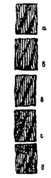 Примечания. 1. n - число несущих проволок в наружных прядях каната; d - диаметр каната, мм. 2. Проволоки заполнения не считаются несущими, поэтому не подлежат учету. В канатах с несколькими слоями прядей учитываются проволоки только видимого наружного слоя. В канатах со стальным сердечником последний рассматривается как внутренняя прядь и не учитывается. 3. Число обрывов не следует путать с количеством оборванных концов проволок, которых может быть в 2 раза больше. 4. Для канатов конструкции с диаметром наружных проволок во внешних прядях, превышающим диаметр проволок нижележащих слоев, класс конструкции понижен и отмечен звездочкой. 5. При работе каната полностью или частично с блоками из синтетического материала или из металла с синтетической футеровкой отмечается появление значительного числа обрывов проволок внутри каната до появления видимых признаков обрывов проволок или интенсивного износа на наружной поверхности каната. Такие канаты отбраковываются с учетом потери внутреннего сечения. 6. Незаполненные строки в графе «Конструкции канатов по ИСО и государственным стандартам» означают отсутствие конструкций канатов с соответствующим числом проволок. При появлении таких конструкций канатов, а также для канатов с общим числом проволок более 300 число обрывов проволок, при которых канат бракуется, определяется по формулам, приведенным в нижней строке таблицы, причем полученное значение округляется до целого в большую сторону. 7. Канаты грузоподъемных машин, предназначенных для подъема людей, а также транспортирующих расплавленный или раскаленный металл, огнеопасные и ядовитые вещества, бракуют при вдвое меньшем числе обрывов проволок. 3. При уменьшении диаметра каната в результате поверхностного износа (рис. 4) или коррозии (рис. 5) на 7 % и более по сравнению с номинальным диаметром канат подлежит браковке даже при отсутствии видимых обрывов проволок. Рис. 4. Износ наружных проволок каната крестовой свивки: а - небольшие лыски на проволоках; б - увеличенная длина лысок на отдельных проволоках; в - удлинение лысок в отдельных проволоках при заметном уменьшении диаметра проволок; г - лыски на всех проволоках, уменьшение диаметра каната; д - интенсивный износ всех наружных проволок каната (уменьшение диаметра проволок на 40 %) Рис. 5. Поверхностная коррозия проволок каната крестовой свивки: а - начальное окисление поверхности; б - общее окисление поверхности; в - заметное окисление; г - сильное окисление; д - интенсивная коррозия При уменьшении диаметра каната в результате повреждения сердечника - внутреннего износа, обмятия, разрыва и т.п. (на 3 % от номинального диаметра у некрутящихся канатов и на 10 % у остальных канатов) канат подлежит браковке даже при отсутствии видимых обрывов проволок (рис. 6). Рис. 6. Местное уменьшение диаметра каната на месте разрушения органического сердечника При наличии у каната поверхностного износа или коррозии проволок число обрывов как признак браковки должно быть уменьшено в соответствии с данными табл. 2. При уменьшении первоначального диаметра наружных проволок в результате износа (см. рис. 4, д) или коррозии (см. рис. 5, д) на 40 % и более канат бракуется. Таблица 2 Нормы браковки каната в зависимости от поверхностного износа или коррозии