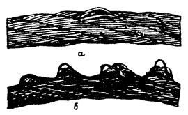 Рис. 2. Сочетание обрывов проволок с их износом: а - в канате крестовой свивки; б - в канате односторонней свивки Рис. 3. Обрывы проволок в зоне уравнительного блока: а - в нескольких прядях каната; б - в двух прядях в сочетании с местным износом б) разрыв пряди; в) поверхностный и внутренний износ; г) поверхностная и внутренняя коррозия; д) местное уменьшение диаметра каната, включая разрыв сердечника; е) уменьшение площади поперечного сечения проволок каната (потери внутреннего сечения); ж) деформация в виде волнистости, корзинообразности, выдавливания проволок и прядей, раздавливания прядей, заломов, перегибов и т.п.; з) повреждения в результате температурного воздействия или электрического дугового разряда. 2. Браковку канатов, работающих со стальными и чугунными блоками, следует проводить по числу обрывов проволок в соответствии с табл. 1. Канаты грузоподъемных машин, предназначенных для подъема людей, а также, транспортирующих расплавленный или раскаленный металл, огнеопасные и ядовитые вещества, бракуют при вдвое меньшем числе обрывов проволок. Таблица 1 Число обрывов проволок, при наличии которых канаты двойной свивки, работающие со стальными и чугунными блоками, бракуются