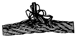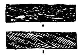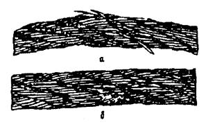 Рис. 2. Сочетание обрывов проволок с их износом: а - в канате крестовой свивки; б - в канате односторонней свивки Рис. 3. Обрывы проволок в зоне уравнительного блока: а - в нескольких прядях каната; б - в двух прядях в сочетании с местным износом б) разрыв пряди; в) поверхностный и внутренний износ; г) поверхностная и внутренняя коррозия; д) местное уменьшение диаметра каната, включая разрыв сердечника; е) уменьшение площади поперечного сечения проволок каната (потери внутреннего сечения); ж) деформация в виде волнистости, корзинообразности, выдавливания проволок и прядей, раздавливания прядей, заломов, перегибов и т.п.; з) повреждения в результате температурного воздействия или электрического дугового разряда. 2. Браковку канатов, работающих со стальными и чугунными блоками, следует проводить по числу обрывов проволок в соответствии с табл. 1. Канаты грузоподъемных машин, предназначенных для подъема людей, а также, транспортирующих расплавленный или раскаленный металл, огнеопасные и ядовитые вещества, бракуют при вдвое меньшем числе обрывов проволок. Таблица 1 Число обрывов проволок, при наличии которых канаты двойной свивки, работающие со стальными и чугунными блоками, бракуются
