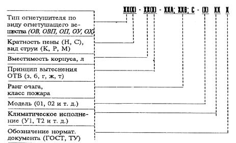 4. КЛАССИФИКАЦИЯ4.1. Огнетушители по виду применяемого огнетушащего вещества подразделяют на: - водные (ОВ); - воздушно-пенные (ОВП); - порошковые (ОП); - газовые, в том числе: углекислотные (ОУ); хладоновые (ОХ). 4.2. Водные огнетушители по виду выходящей струи ОТВ подразделяют на: - огнетушители с распыленной струей (Р): средний диаметр капель спектра распыливания более 100 мкм; - огнетушители с мелкодисперсной распыленной струей (М): средний диаметр капель спектра распыливания 100 мкм и менее; - огнетушители с компактной струей (К). 4.3. Воздушно-пенные огнетушители по кратности пены подразделяют на: - низкой кратности (Н) от 5 до 20; - средней кратности (С) свыше 20 до 200. Воздушно-пенные огнетушители в зависимости от химической природы заряда подразделяются на: ОВП с углеводородным зарядом - ОВП (У); ОВП с фторсодержащим зарядом - ОВП (Ф). (Измененная редакция) 4.4. По принципу вытеснения огнетушащего вещества огнетушители подразделяют на: - закачные (з)*; - с баллоном сжатого газа (б); - с газогенерирующим элементом (г); - с эжектирующим устройством (ж); - с термическим элементом (т). 4.5. По возможности перезарядки огнетушители подразделяют на: - перезаряжаемые; - неперезаряжаемые (одноразового пользования). 4.6. По величине рабочего давления огнетушители подразделяют на: - низкого давления (рабочее давление равно или ниже 2,5 МПа при температуре окружающей среды (20 ± 2) °С); - высокого давления (рабочее давление выше 2,5 МПа при температуре окружающей среды (20 ± 2) °С). * К закачным относятся также огнетушители, в которых огнетушащее вещество находится под давлением собственных паров. 4.7. В зависимости от вида заряженного ОТВ огнетушители могут использоваться для тушения загораний одного или нескольких из следующих классов пожаров горючих веществ: - твердых, горючих веществ (А); - жидких горючих веществ (В); - газообразных (С); - электрооборудования, находящегося под напряжением (Е). 4.8. Огнетушители должны иметь следующую структуру обозначения