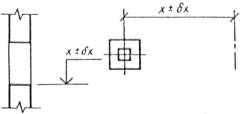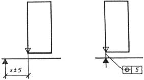 2.8. При необходимости указания на чертеже технологического процесса, к которому относятся характеристики точности геометрического параметра, в том числе функционального, следует применять следующие буквенные обозначения: М - процесс изготовления элементов; S - процесс разбивки; Е - процесс установки элементов; В - функциональный геометрический параметр. Буквенное обозначение вписывают в дополнительную рамку, помещаемую слева от рамки, в которой указывают допуски или предельные отклонения. Если буквенное обозначение относится к геометрическому параметру по п. 2.1, оно приставляется непосредственно за предельным отклонением (например, 6000 ± 6 S). 2.9. При обозначении на чертежах характеристик точности установки элементов следует указывать монтажные ориентиры. Ориентиры обозначают: 1) зачерненным треугольником на монтажном горизонте или ранее установленном элементе. На разрезе ориентир для установки элемента в плане помещают под линией монтажного горизонта вершиной вверх (черт. 4); ориентир для установки элемента по высоте показывают направленным по горизонтали (Черт. 5).