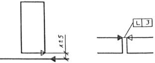 На плане ориентир помещают симметрично линии (оси, грани элемента), относительно которой выполняется установка (черт. 6); 2) незачерненным треугольником на устанавливаемом элементе. Этот ориентир помещают симметрично на линии (оси) или грани устанавливаемого элемента. При этом вершины каждой пары треугольников должны быть направлены друг к другу.